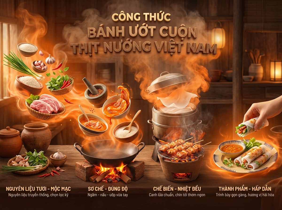 Bánh ướt cuộn thịt nướng là một món ăn truyền thống hấp dẫn, nổi tiếng với sự hòa quyện tinh tế giữa vị ngọt mềm của thịt nướng, sự thanh mát của rau sống và độ dai mượt của bánh ướt. Món ăn này không chỉ chinh phục thực khách bởi hương vị đặc trưng mà còn bởi cách chế biến tỉ mỉ, đòi hỏi sự khéo léo. Bài viết này sẽ chia sẻ công thức món Bánh Ướt Cuộn Thịt Nướng chuẩn vị, giúp bạn tự tay thực hiện món ngon này ngay tại nhà.