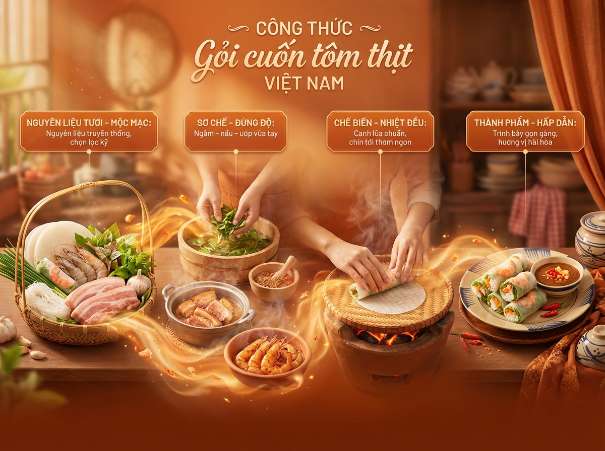 Gỏi cuốn tôm thịt là một món ăn thanh mát, hấp dẫn và là niềm tự hào của ẩm thực Việt Nam, chinh phục thực khách bởi sự kết hợp hài hòa giữa các nguyên liệu tươi ngon. Không chỉ là món khai vị tuyệt vời, món ăn này còn mang đến hương vị đậm đà, tươi mới, thể hiện sự tinh tế trong cách chế biến. Bài viết này sẽ hướng dẫn bạn công thức chế biến gỏi cuốn tôm thịt chuẩn vị truyền thống, từ khâu chuẩn bị nguyên liệu đến bí quyết tạo nên những cuốn gỏi hoàn hảo.